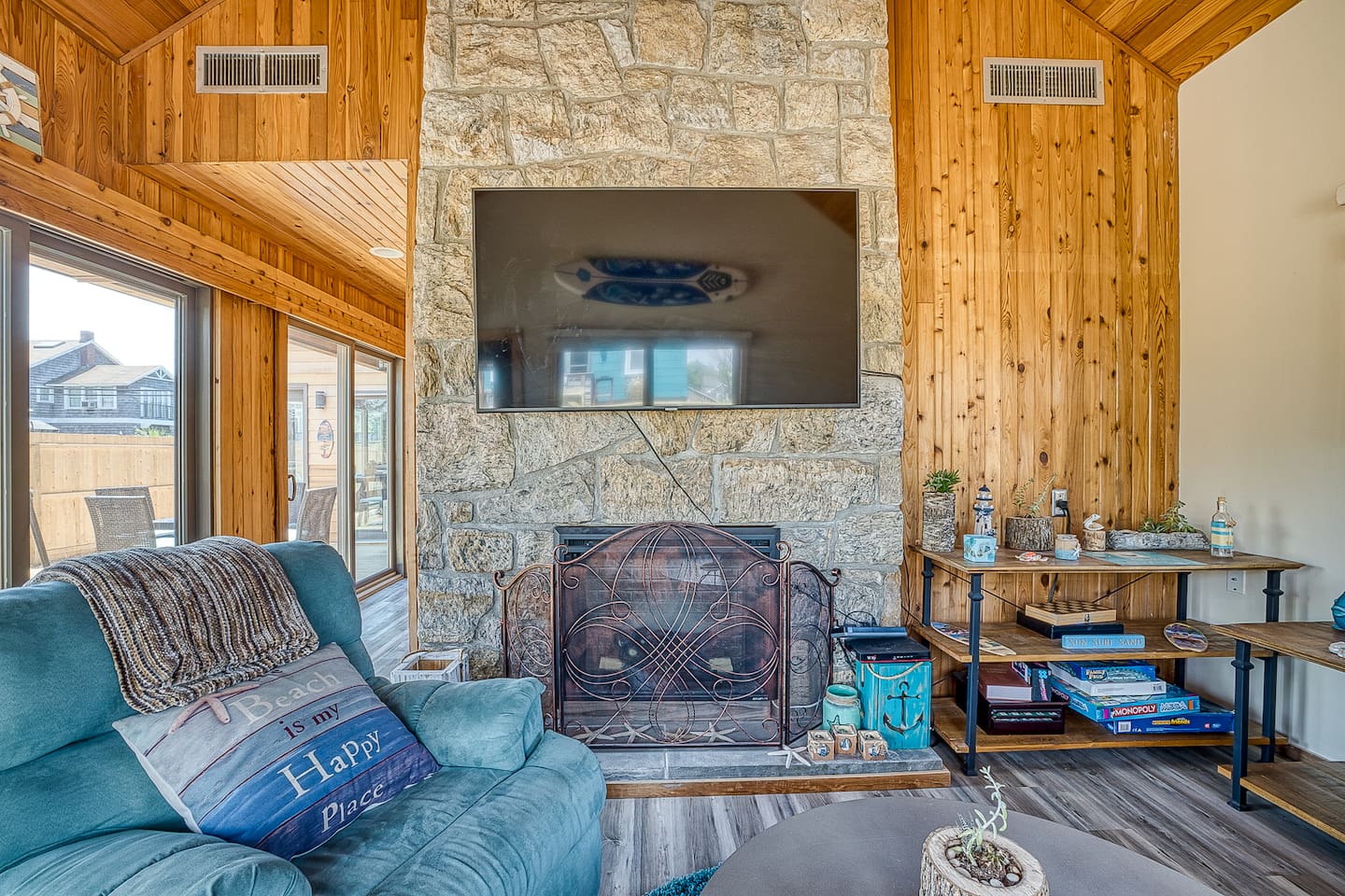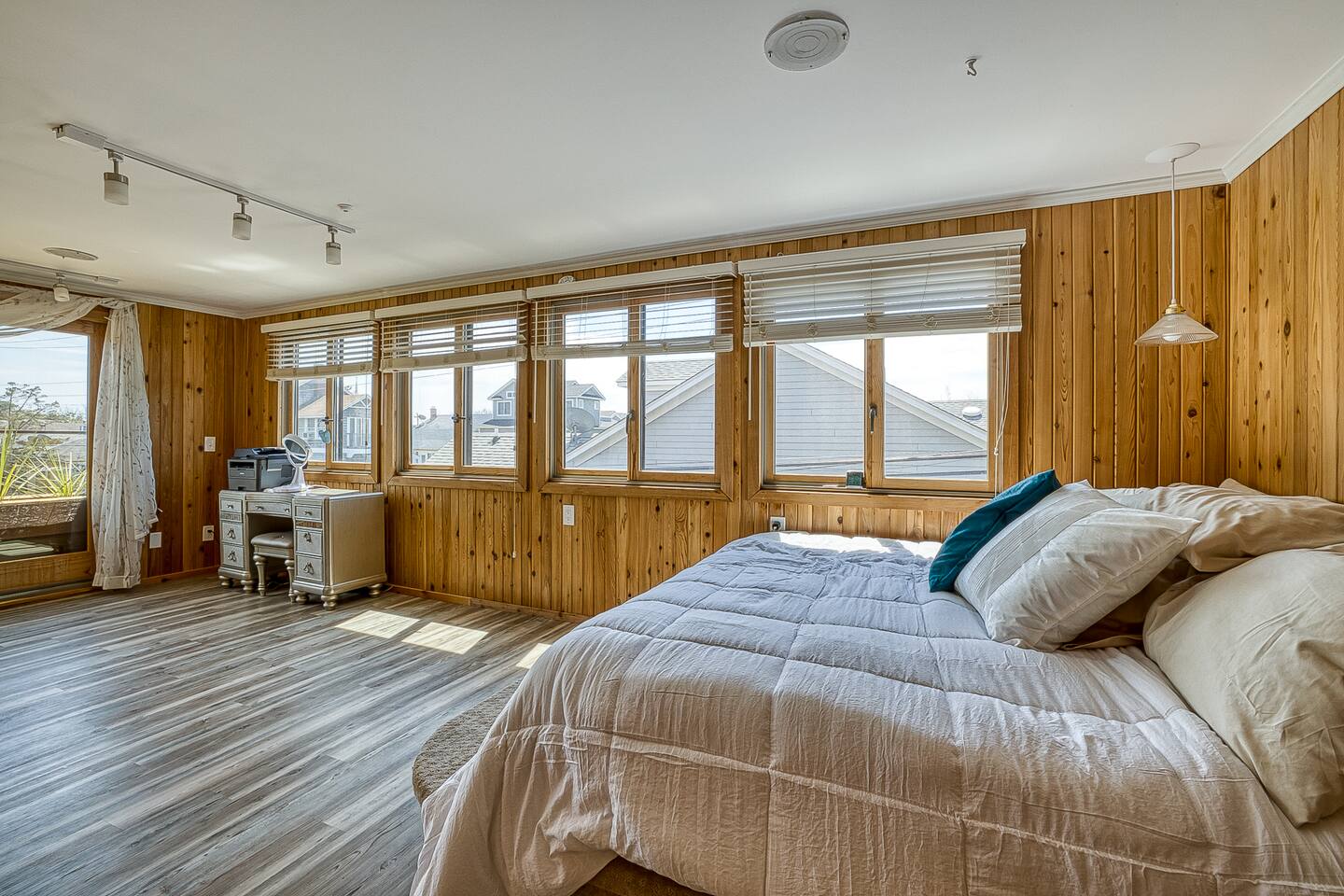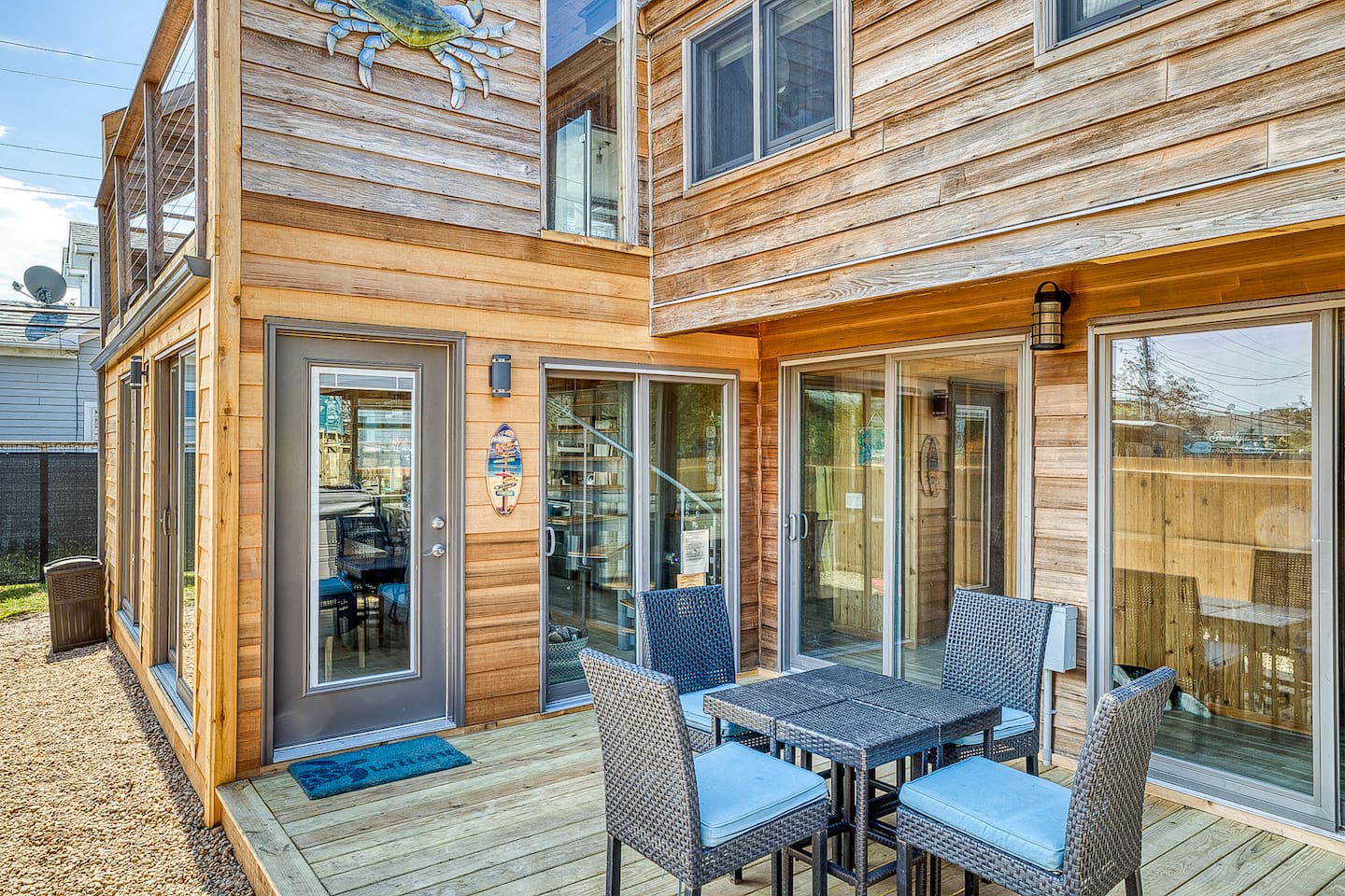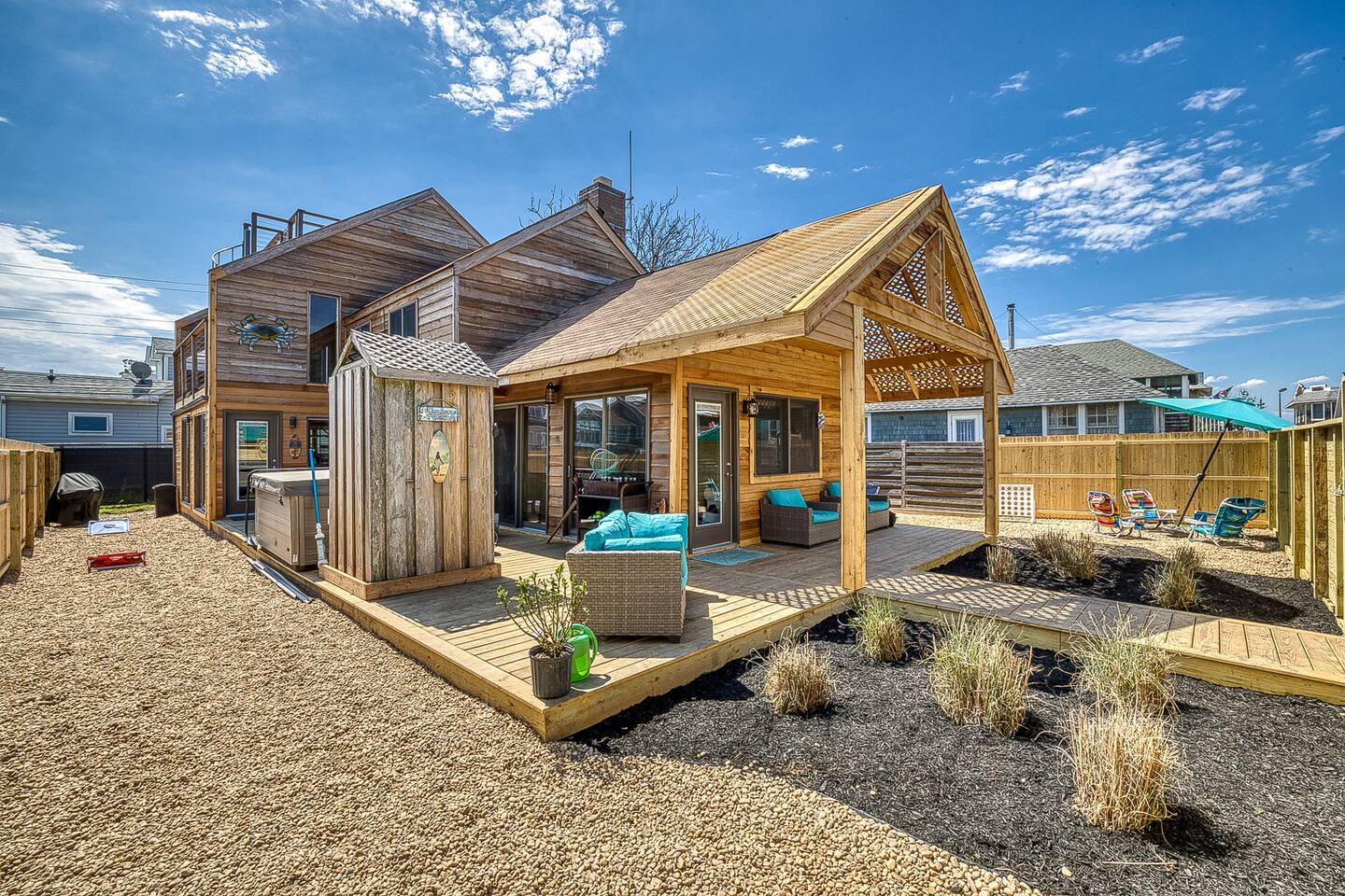 "Located less than 5 minutes to beach and downtown Ocean Beach, this house including 5 Bedrooms and 3 Bathrooms has a true resort hotel feeling, featuring a Jacuzzi, chaise lounges, dining for 8 and grill, and shower and commode on the outside. Interior features gorgeous cedar plank walls, updated kitchen and, central AC and heating. There is WiFi, a Spacious master suite upstairs has a king bed, en suite bathroom and a rooftop area with a TV."